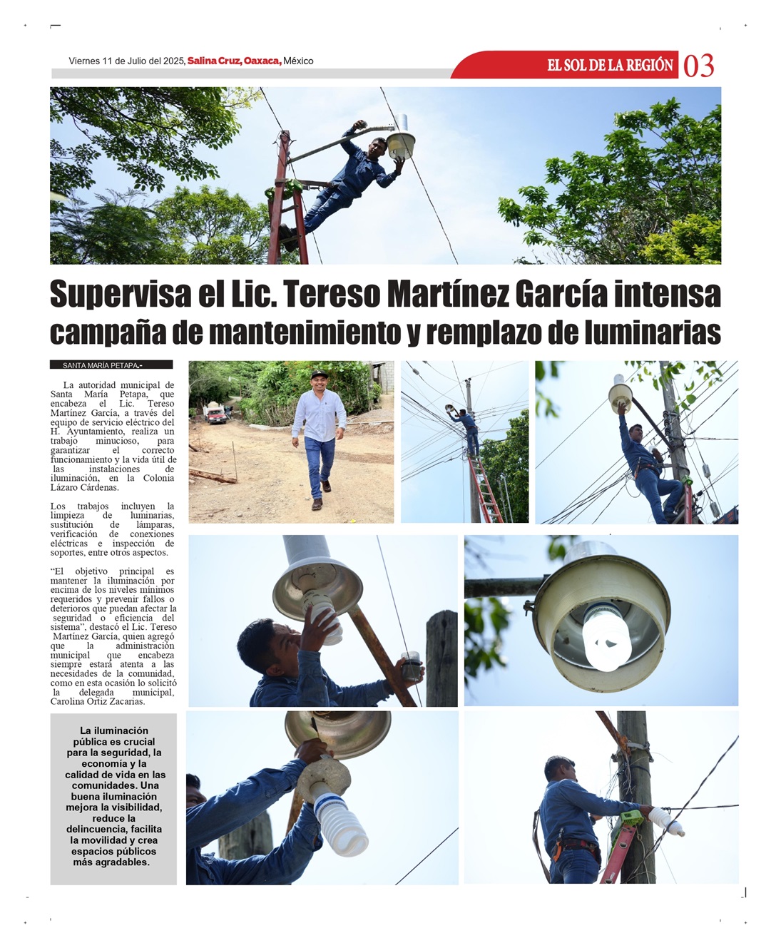 SANTA MARÍA PETAPA.- La autoridad municipal de Santa María Petapa, que encabeza el Lic. Tereso Martínez García, a través del equipo de servicio eléctrico del H. Ayuntamiento, realiza un trabajo minucioso, para garantizar el correcto funcionamiento y la vida útil de las instalaciones de iluminación, en la Colonia Lázaro Cárdenas. Los trabajos incluyen la limpieza de luminarias, sustitución de lámparas, verificación de conexiones eléctricas e inspección de soportes, entre otros aspectos. “El objetivo principal es mantener la iluminación por encima de los niveles mínimos requeridos y prevenir fallos o deterioros…