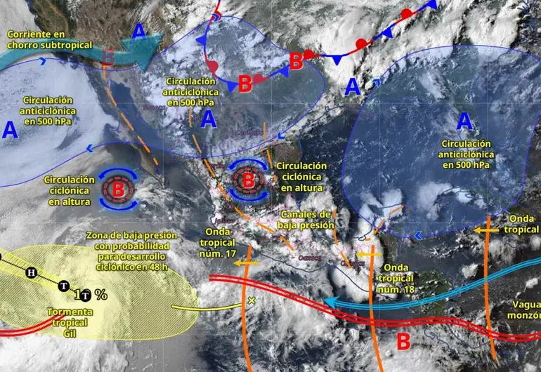Canales de baja presión sobre el interior de la República Mexicana, en interacción con una vaguada en altura sobre la Mesa del Norte, inestabilidad atmosférica y la onda tropical número 17, que se desplazará sobre el occidente del país, ocasionarán lluvias y chubascos en el norte y noreste de México; así como lluvias fuertes a muy fuertes acompañadas de descargas eléctricas en el sur y oriente del país; y con posible caída de granizo en el occidente y centro del territorio nacional. Pronosticándose lluvias puntuales intensas en Jalisco (noroeste y oeste), Colima y Michoacán (oeste).