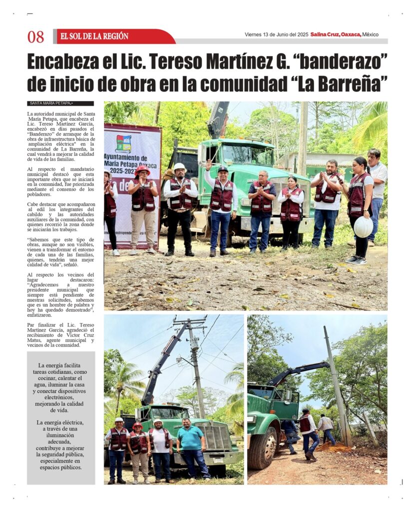 La autoridad municipal de Santa María Petapa, que encabeza el Lic. Tereso Martínez García, encabezó en días pasados el “Banderazo” de arranque de la obra de infraestructura básica de ampliación eléctrica» en la comunidad de La Barreña, la cual vendrá a mejorar la calidad de vida de las familias.