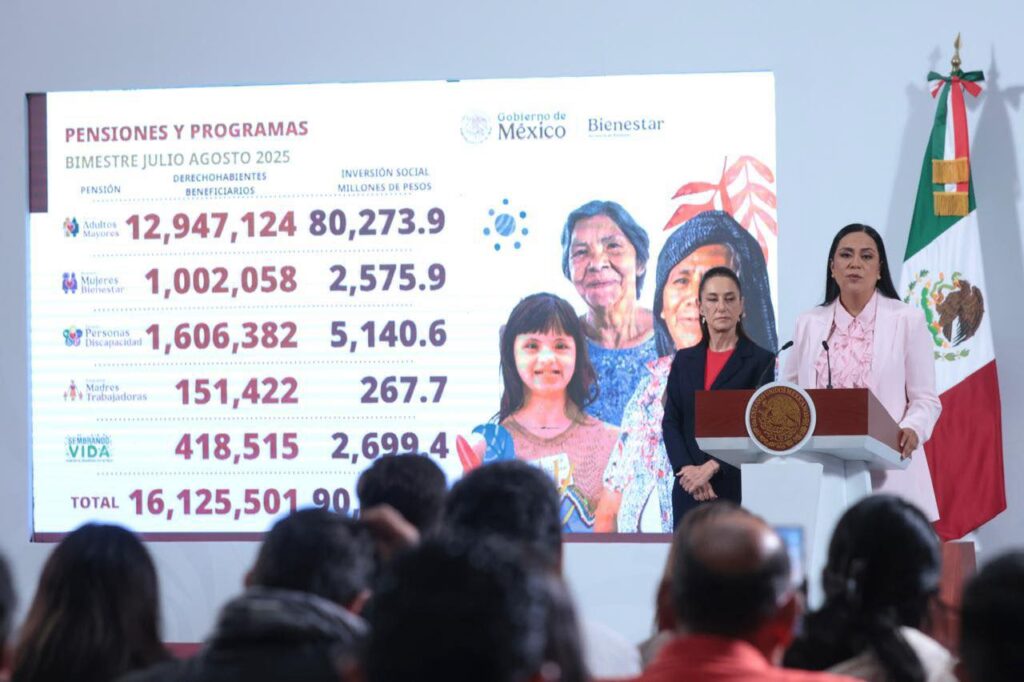 | La secretaria de Bienestar, Ariadna Montiel Reyes, informó que, a la fecha, ya son 16 millones 125 mil beneficiarios y beneficiarias de los Programas para el Bienestar, con lo que este bimestre significa una inversión social de 90 mil 957 mdp. Anunció que, durante el registro del mes de junio, a la Pensión Adultos Mayores se incorporaron 221 mil personas mayores de 65 años, mientras que en la Pensión Mujeres Bienestar fueron 159 mil mujeres de 63 y 64 años, además de que en agosto se abrirá la convocatoria de 60 a 63 años. Sobre el programa Salud Casa por Casa destacó que se han realizado un millón de visitas y censado a más de nueve millones de personas. Acerca de la Clínica es Nuestra ya son 8 mil 78 clínicas que han conformado su Comité de 8 mil 638 unidades de salud. |