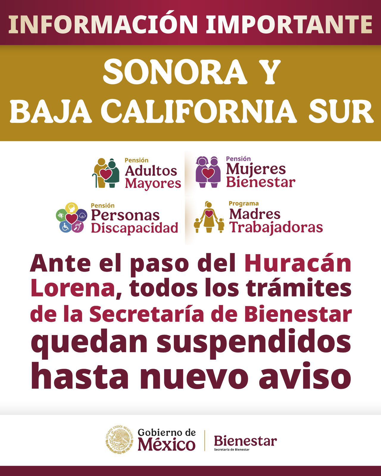 Ante el paso del huracán Lorena en las costas de Baja California Sur y Sonora, la Secretaría de Bienestar, a cargo de Ariadna Montiel Reyes, suspendió todas las actividades, hasta nuevo aviso, con el propósito primordial de resguardar la seguridad e integridad física de la población.